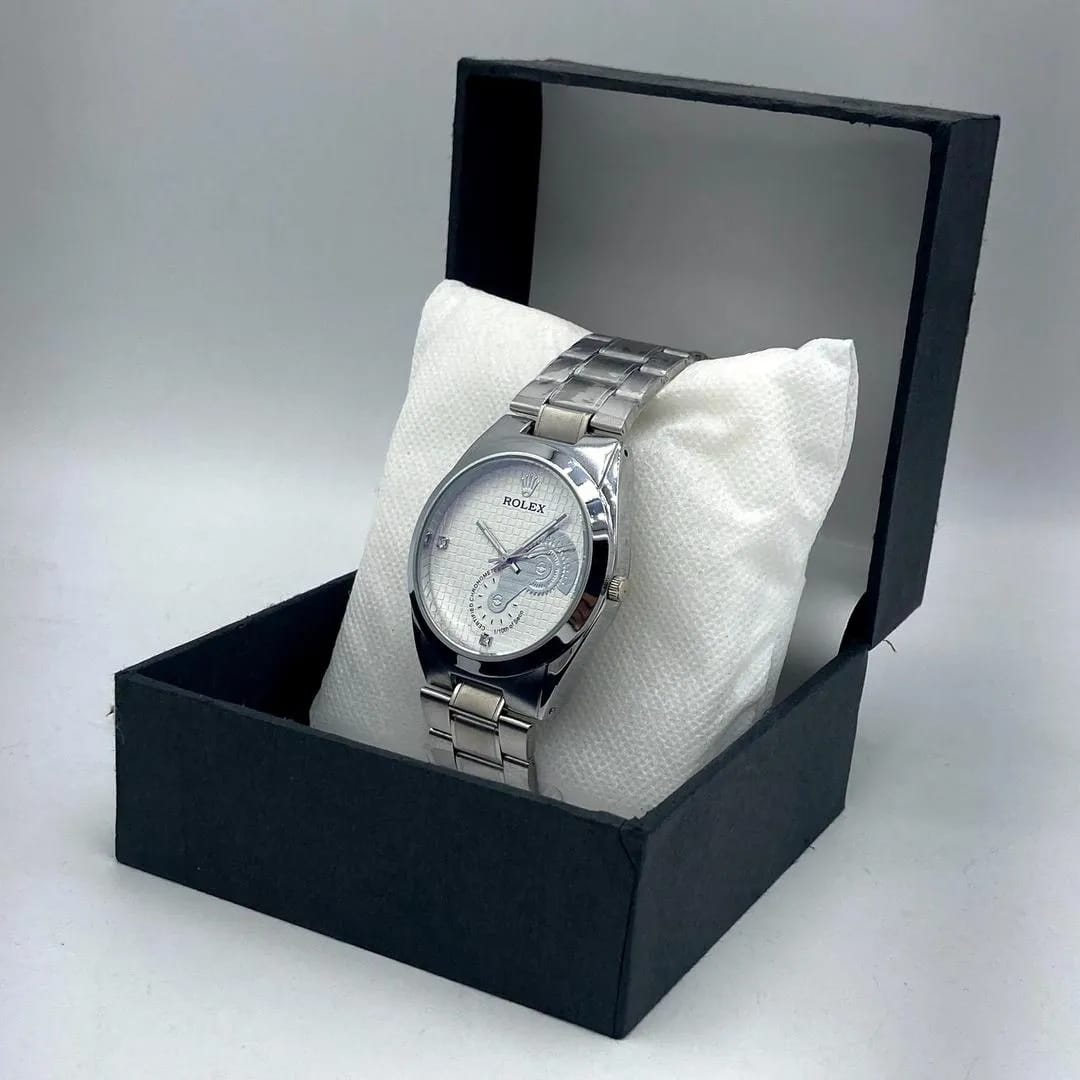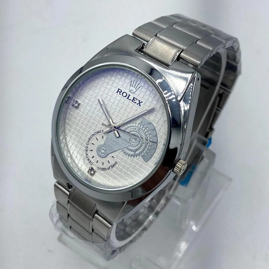 Add a touch of sophistication to your style with the Men's Elegant Stainless Steel Watch. This decorative timepiece features a silver-tone polished stainless steel case and chain strap, complemented by a cream/off-white textured dial with checkered detailing. The dark blue and black printed accents, along with clear faux diamond hour markers, create a refined and modern aesthetic. Note: This watch is designed for style — the sub-dials and markings are decorative and non-functional.